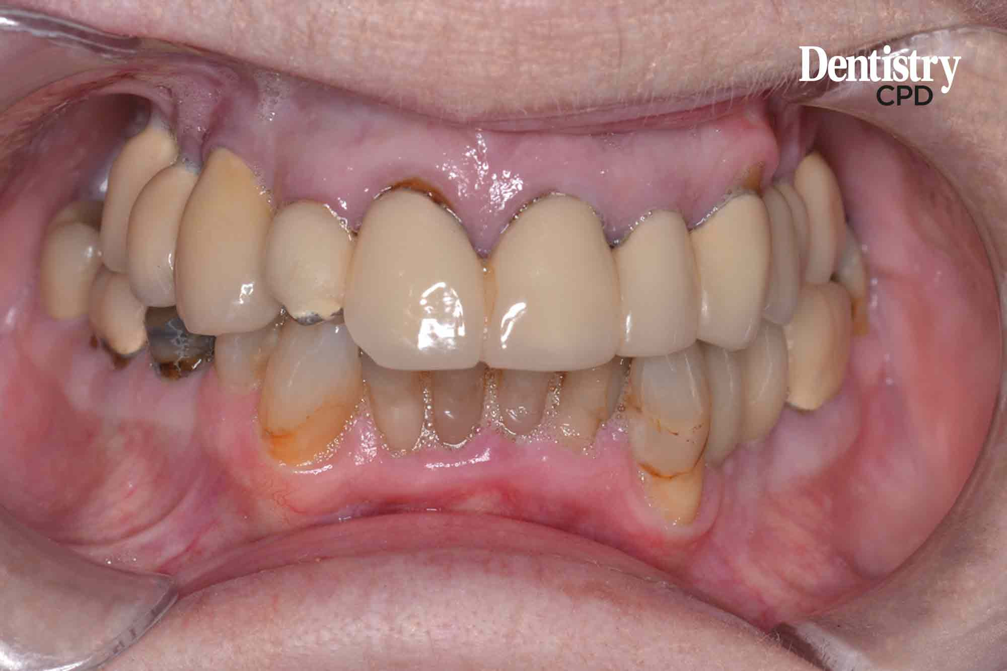 To detail the replacement of failing anterior porcelain-fused-to-metal linked crowns with individual lithium disilicate crowns.